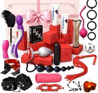 طقم زوجي متكامل داخل صندوق هدية أنيق يضم أدوات متنوعة بتصميم راقٍ وجودة عالية، مناسب للأزواج الباحثين عن تجربة خاصة مع توصيل سري وآمن.